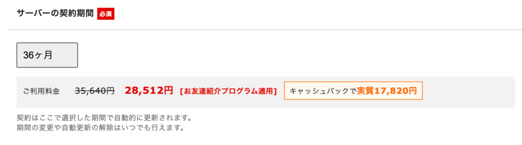 次回、サーバーを更新する際には割引は効きませんので、どうせならば長い期間で契約しておくのがお得です。